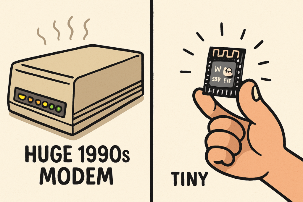 Avançamos décadas. O modem de 56k virou peça de museu, e a internet está em tudo. Inclusive naquele chip minúsculo que custa menos que um café: o ESP8266.